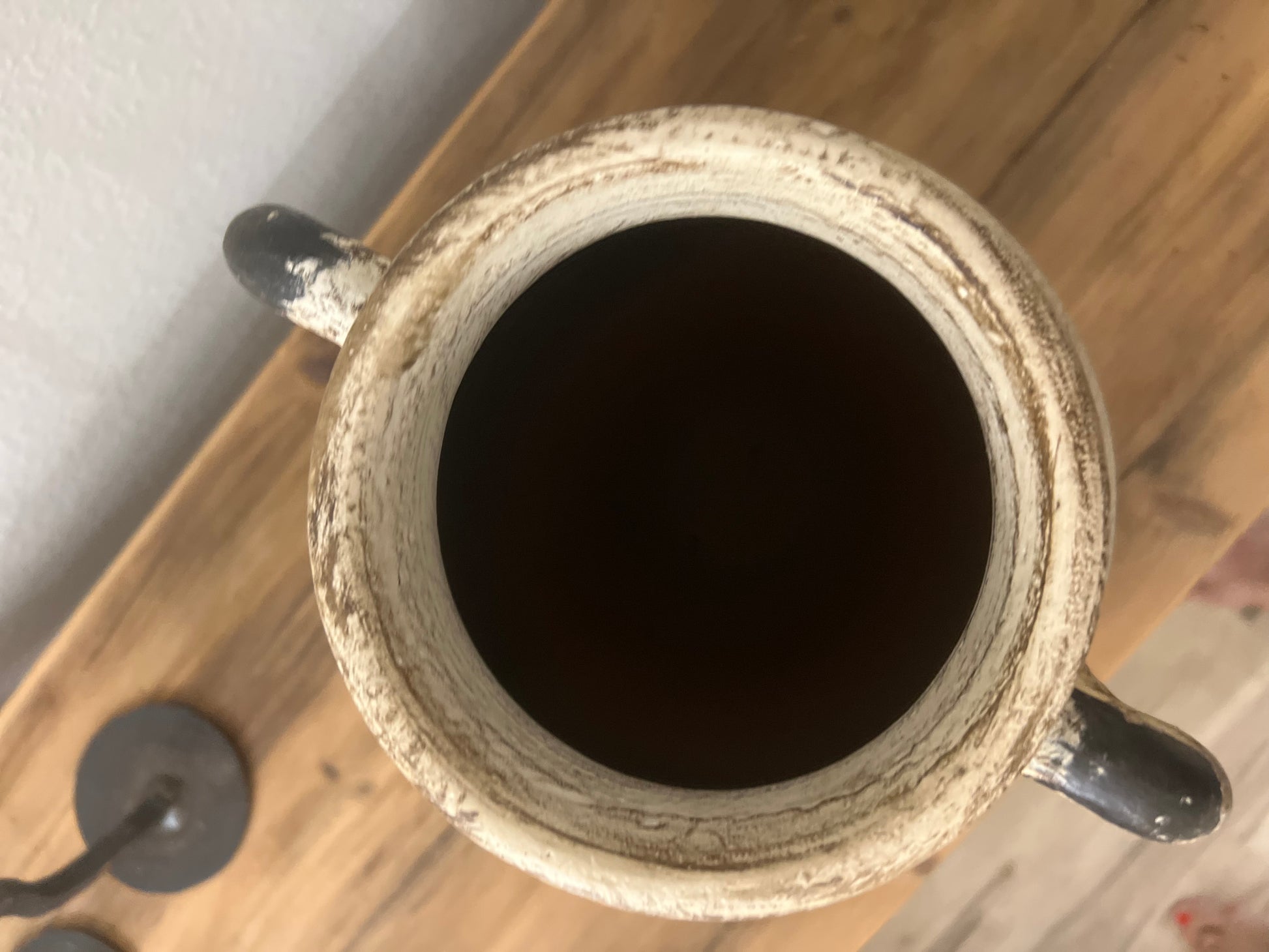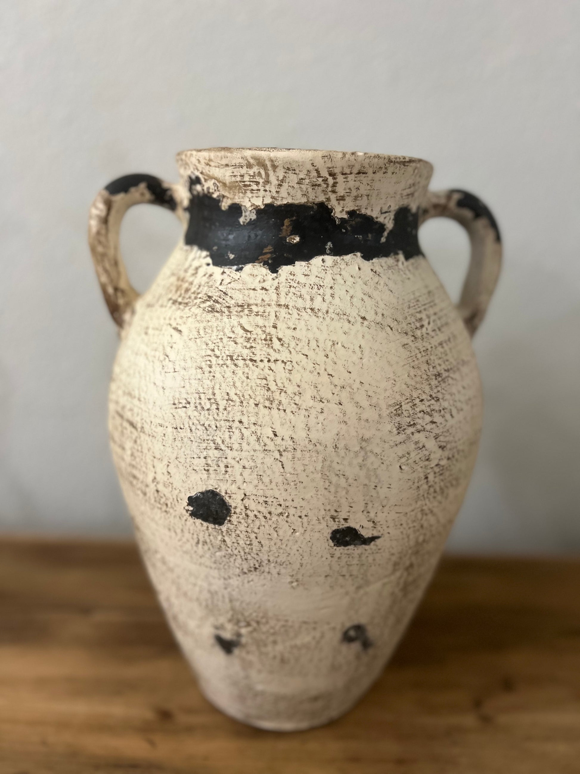 A dramatic, artful amphora with a rare noir crest and layered, tactile patina. This vessel reads like an aged relic unearthed from an old French atelier — weathered brushwork, subtle texture, and soulful imperfections that lend romance and authenticity. A striking statement on its own or filled with wild florals.